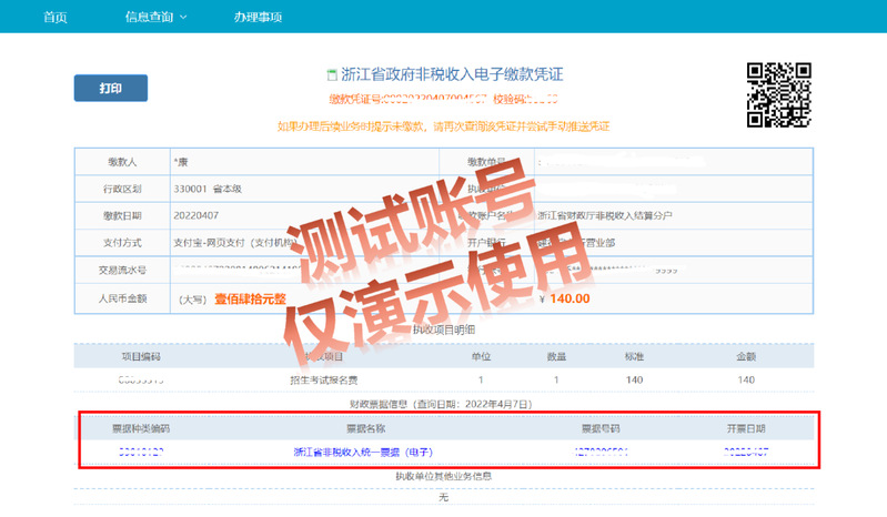 缴费成功后 系统平台会自动生成非税收入 电子缴款凭证、电子票据, 可点击 下方的“浙江省非税收入统一票据(电子)”获得电子票据;或者通过手机 “浙里办APP”,点击 “我的-我的票据” 查询电子票据,并 自行下载打印“财政电子票据”。
