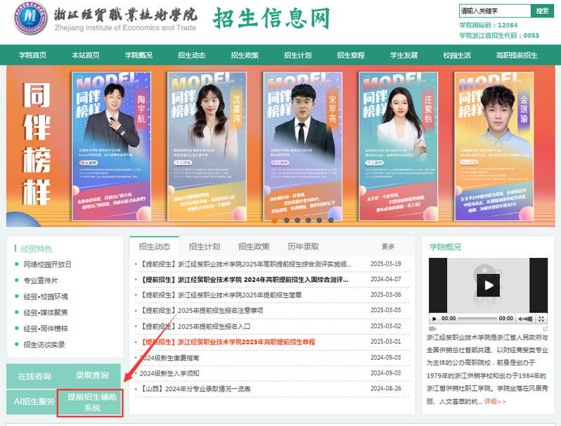 第一步,登录浙江经贸职业技术学院招生信息网( http://zs.zjiet.edu.cn),点击“提前招生辅助系统”。