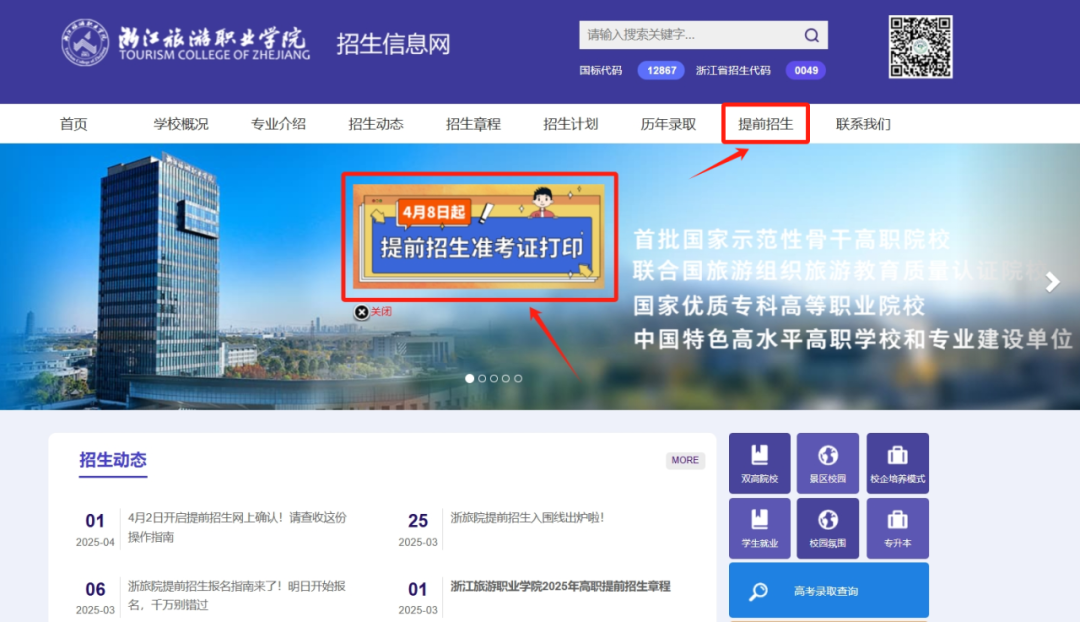 1.进入我校招生信息网(https://zs.tourzj.edu.cn)后,点击“准考证打印”浮动图标或点击“提前招生”栏