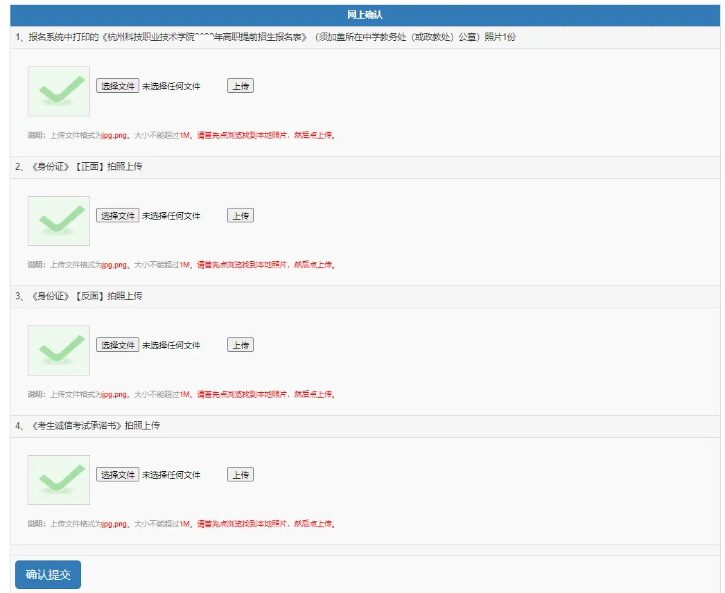 1.入围考生请继续完成“网上确认”,按要求上传“杭州科技职业技术学院2024年高职提前招生报名表”、“身份证正面”、“身份证反面”、“考生诚信考试承诺书”,确保上传成功后,再点击“确认提交”。上传不要错位,不要误传其他学校的报名表和承诺书。