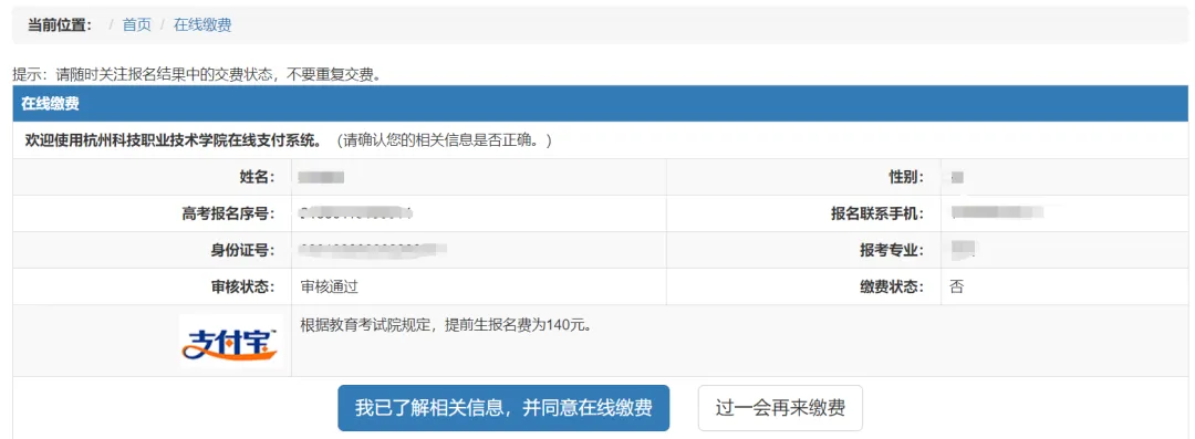 2.入围考生继续完成“在线缴费”,我校高职提前招生报名考试费140元/人。