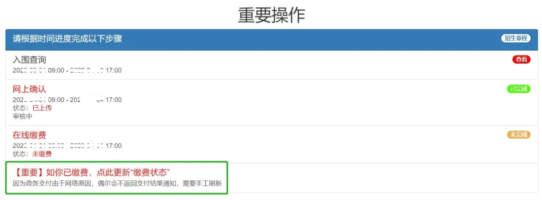 缴费完成后,请返回“重要操作”窗口,如“在线缴费”状态仍显示为“未缴费”,请点击“【重要】如你已缴费,点此更新‘缴费状态’”按钮进行刷新。