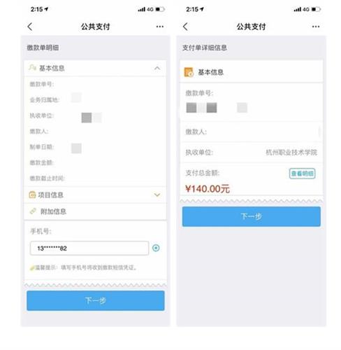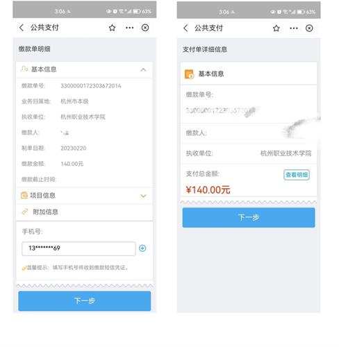 ③确认信息与金额(每人140元)后填写手机号(该手机号将收到缴款短信凭证),点击“下一步”,进行政务支付。