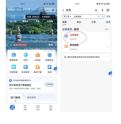 ① 登录浙里办,搜索“公共支付”,后点击“公共支付”