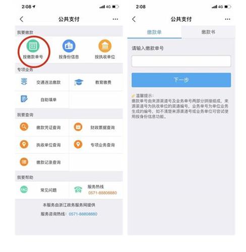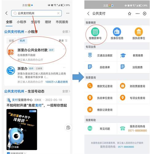 ① 登录支付宝,搜索“公共支付-杭州”;选择“浙里办公共业务付款”→点击“按缴款单号”